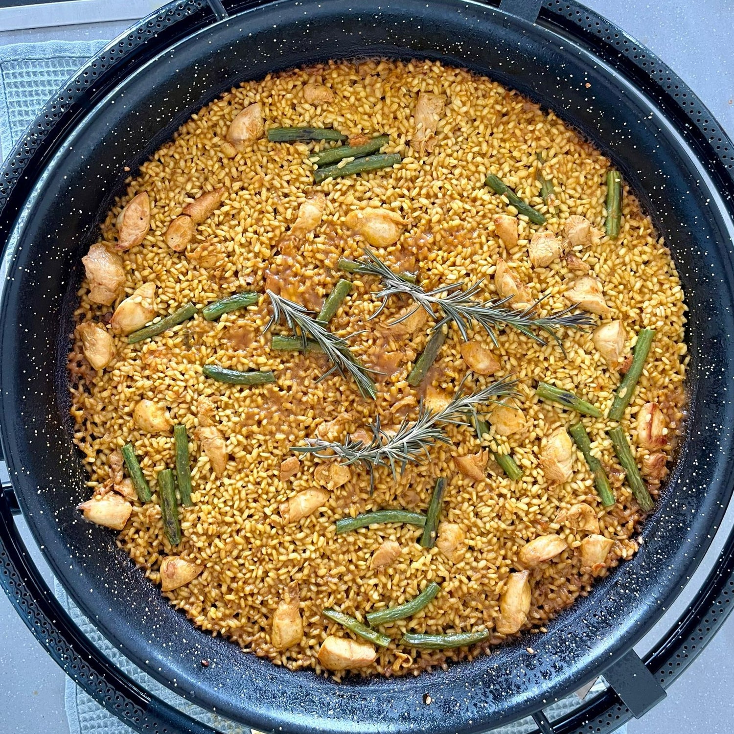 Die valencianische Paella ist ein traditionelles spanisches Gericht aus Valencia, das mit Reis, Hühnchen und frischem Gemüse zubereitet wird. Gewürzt mit Safran und anderen Gewürzen, ist es ein Symbol der mediterranen Küche und spanischen Tradition.